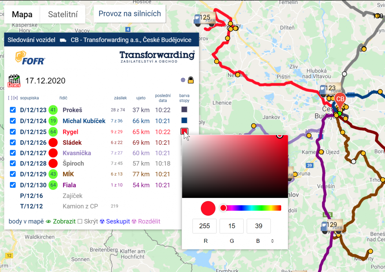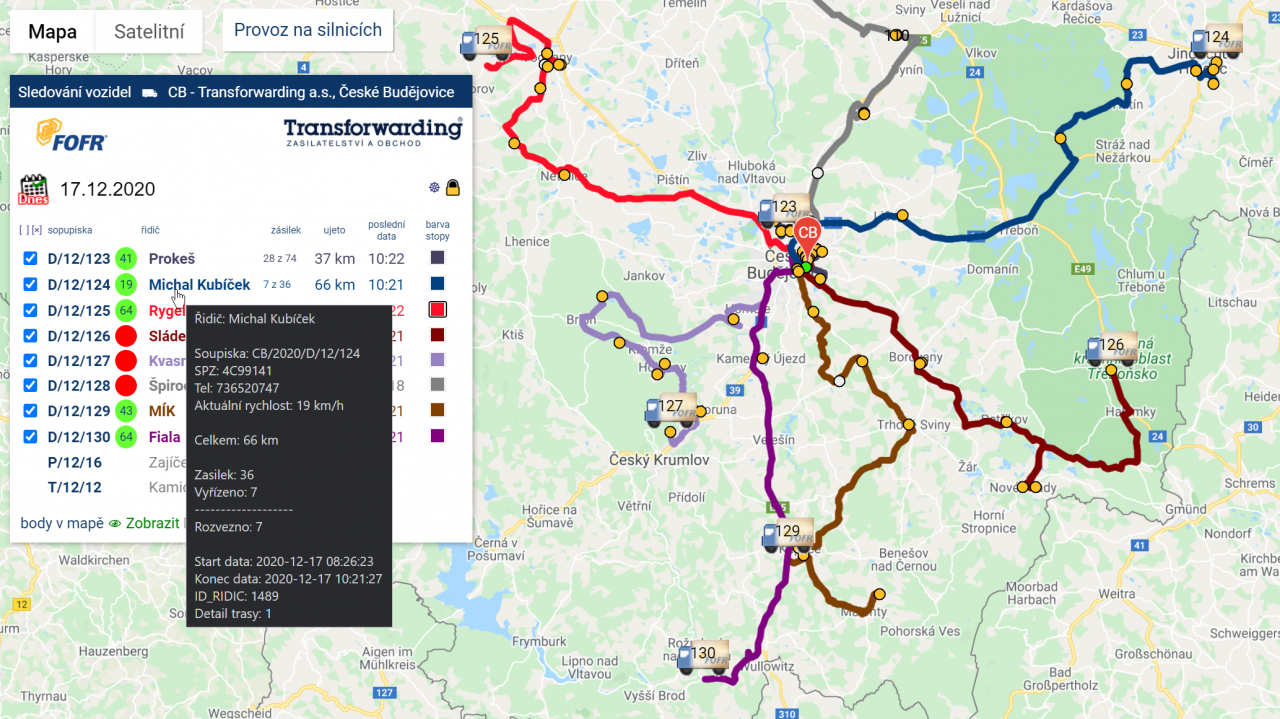 Skrýt a znovu zobrazit trasy řidičů je možné pomocí zaškrtávátka na začátku řádky (před soupiskou). Hromadně pak v záhlaví tabulky.