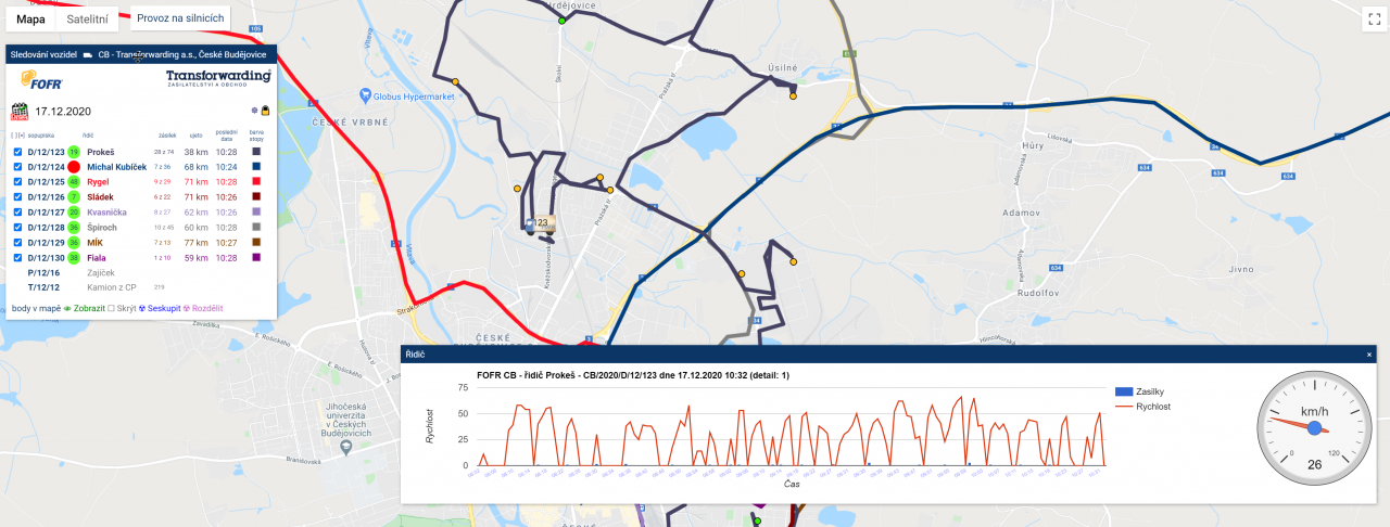 Kliknutím na jméno řidiče je zobrazena jeho pozice na mapě v detailu, zobrazí se graf rychlosti a aktuální rychlost.