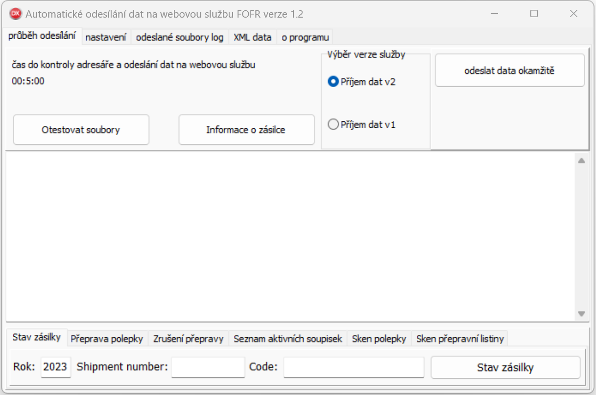 V nové verzi softwaru přibyla možnost vybrat si verzi služby přes kterou chcete data odeslat a možnost soubory pouze otestovat bez toho aby byly následně odeslány. Data se otestují podle standartu verze 2 příjem dat.
