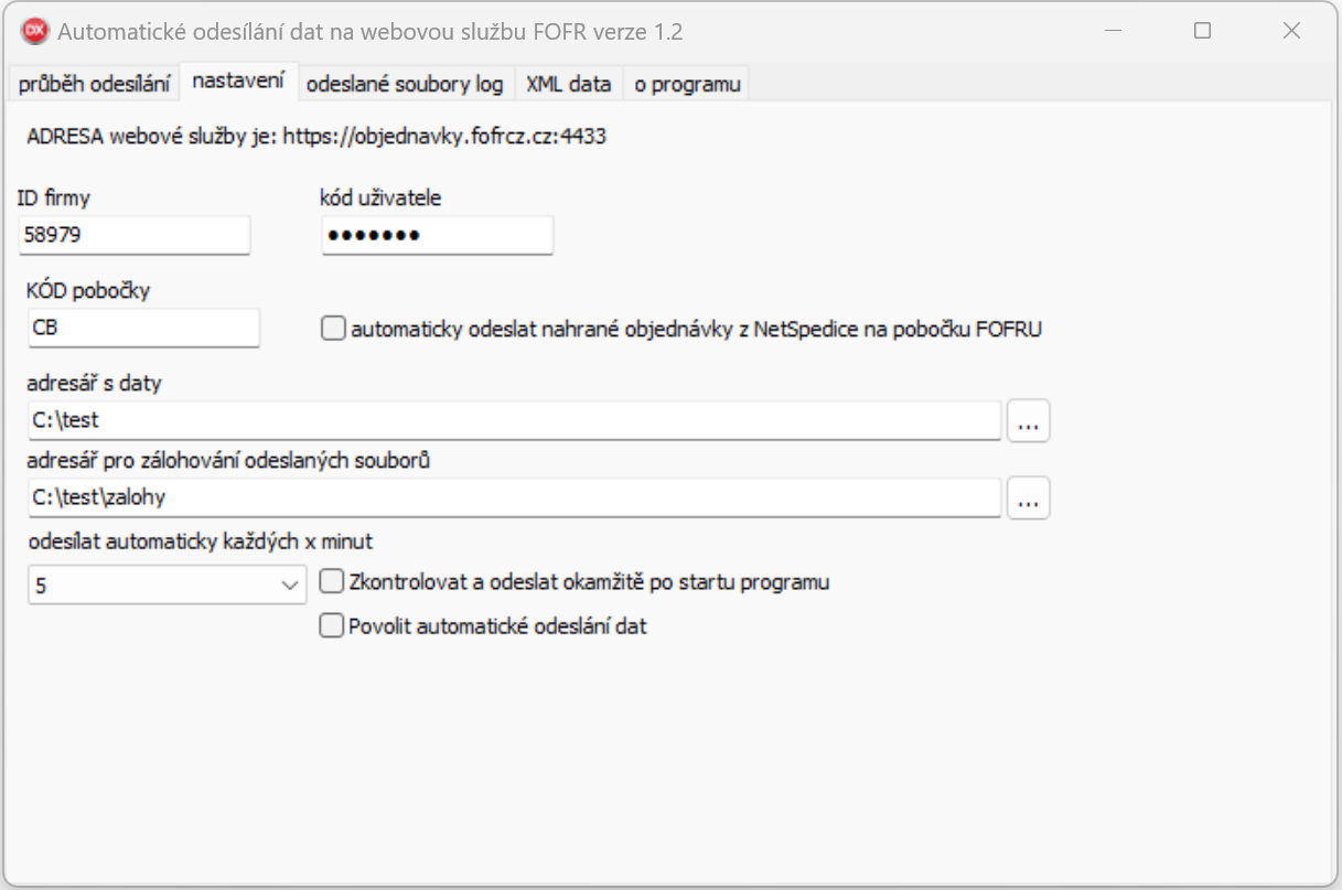 Software pro automatické odesílání XML souborů z Vašeho lokálního adresáře na naší webovou službu naleznete ke stažení zde: https://www.transforwarding.cz/software/spedice/popis_sluzeb/programy/FofrXmlSenderWS.zip