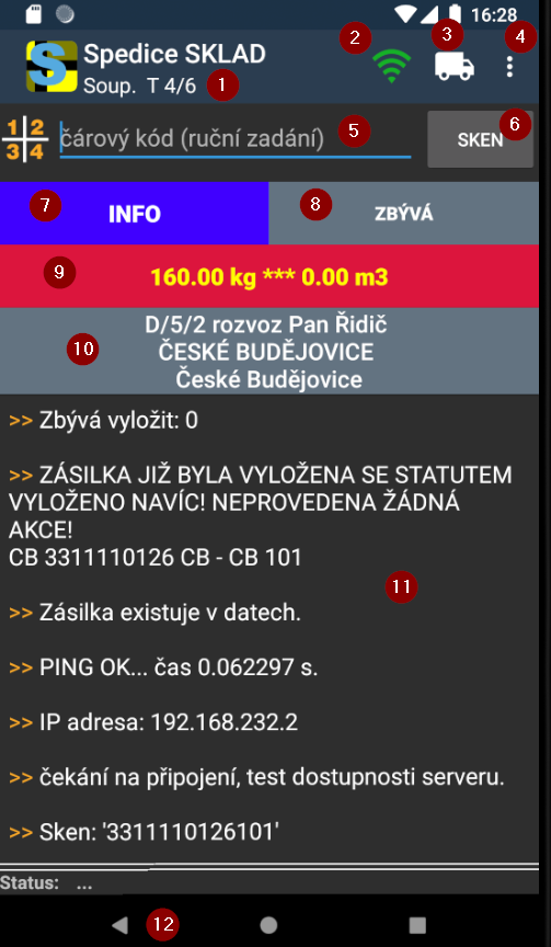 (stisknutím tlačítka je možné označit soupisku pro dispečink jako ukončenou – zobrazí se v příkazech programu Spedice) - Informační okno s výpisem procesu skenování