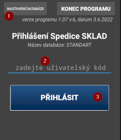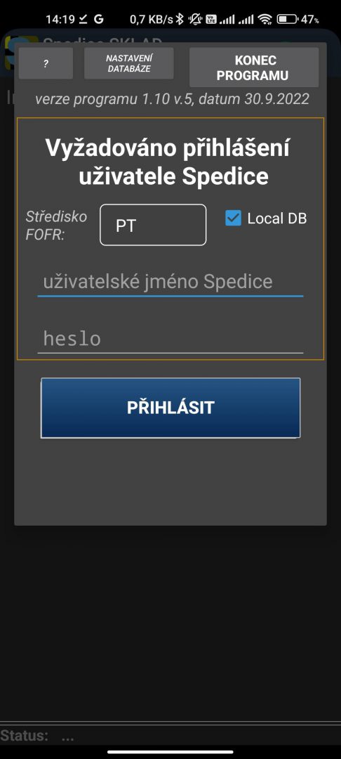 Po úspěšném přihlášení dojde k automatickému načtení a uložení konfigurace připojení střediska do databáze Spedice a přihlášení uživatele skladu.
