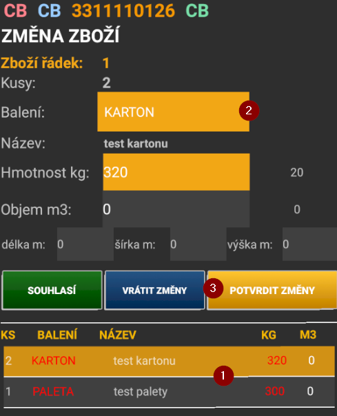 (na pravé straně zobrazeny originální hodnoty) - Tlačítka pro Potvrzení změn / Vrácení změn na originální hodnoty / Odsouhlasení zboží beze změny