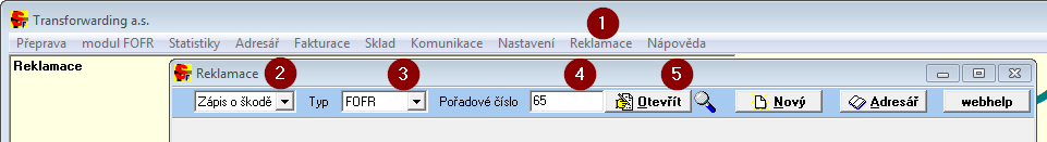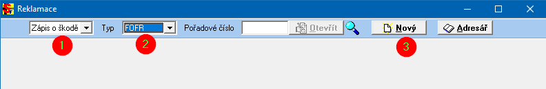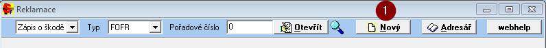 Otevření formuláře z hlavního menu v záložce „Reklamace“